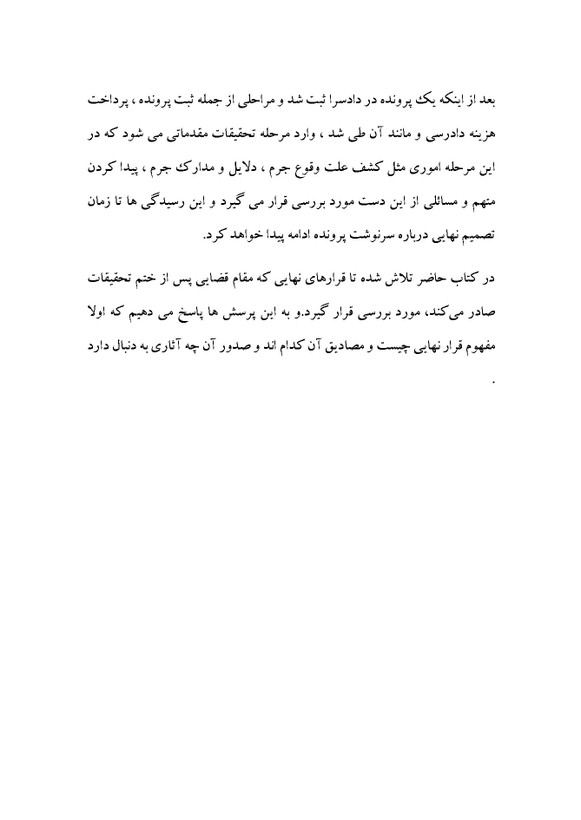 کتاب قرارهای نهایی در قانون آئین دادرسی کیفری اثر دکتر محمدعلی امیری نشر دهکده مدرن کتابی متفاوت از آنچه در بازار وجود دارد که به تحلیل نکارت ریز و پنهان و کاربردی قرارهای نهایی در قالب سه فصل که فصل اول به مفهوم شناسی و در فصل دوم به قرارهای نهایی مختومه کننده پرونده(قرارموقوفی تعقیب - قرار منع تعقیب- قرار جلب به دادرسی ) ودر فصل سوم به قرارهای نهایی غیر مختومه کننده پرونده( قرار ترک تعقیب - قرار توقف تحقیقات ) مورد بررسی قرار گرفته است